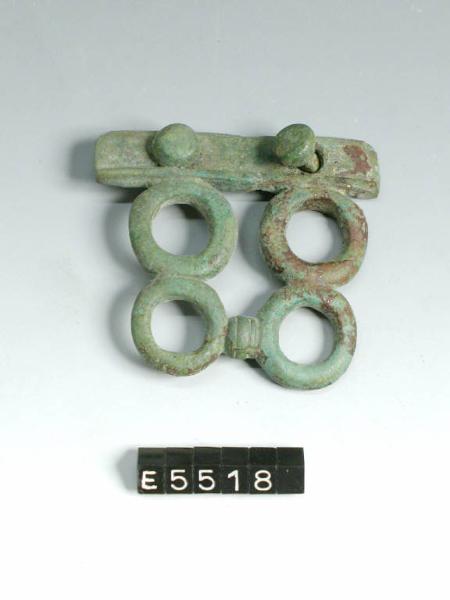 Elemento in bronzo costituito da lamina rettangolare con due ribattini e quattro fori circolari disposti a quadrato (probabilmente si tratta dell'attacco dell'ansa di un recipiente bronzeo non meglio identificabile).