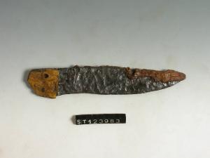 Lama di coltello con profilo concavo-convesso; si conserva un ribattino per l'immanicatura presumibilmente in legno.