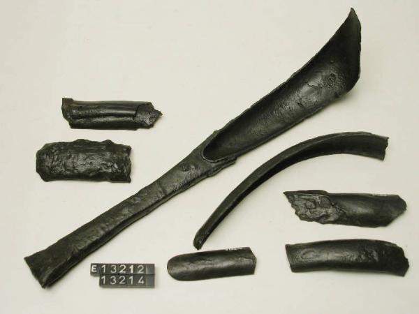 Frammenti pertinenti all'impugnatura di uno strigile di ferro,a fenestratura rettangolare, in verghetta a margni ripiegati, che si ricongiunge alla spatola prolungandosi in una costolatura foliata a rilievo.