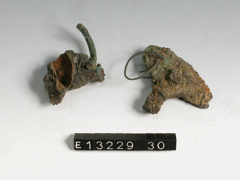 Agglomerato in cui si riconoscono un frammento di ferro e di un anellino in verghetta di bronzo di sezione circolare