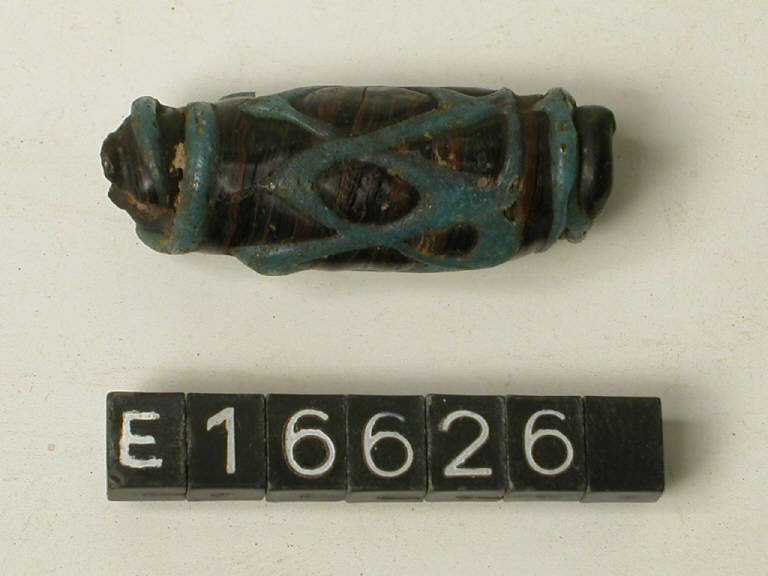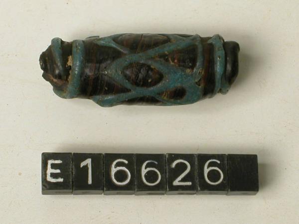 Perla tubolare di vetro policromo bruno con decorazione lineare azzurra