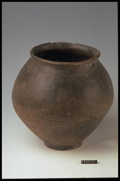 Urna biconico ovoidale decorata lungo la gola e il diametro massimo da linee parallele incise bordate da file di puntini impressi.
