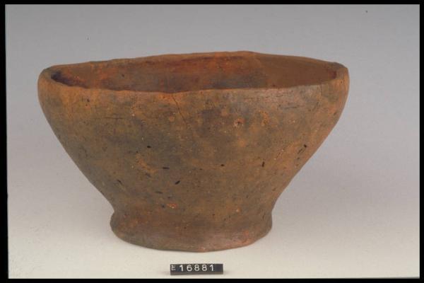 Ciotola a corpo troncoconico, orlo leggermente rientrante, basso piede obliquo.
