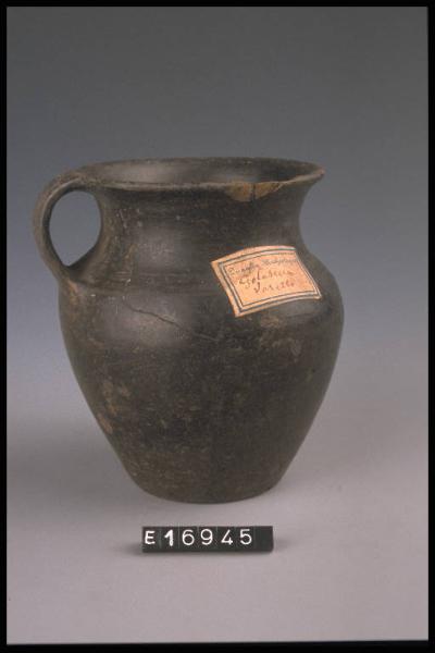 Boccale a corpo ovoide con ansa verticale a nastro, labbro esoverso, collo a pareti inflesse, spalla alta. Tre solcature sopra la spalla.