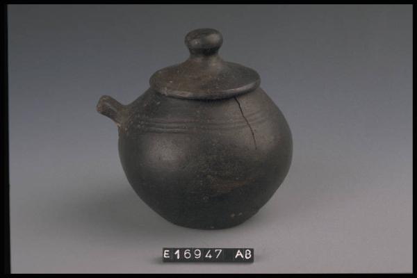 Vasetto globulare con prese a lingua decorata da tre solcature parallele sopra la spalla che in corrispondenza delle prese formano un motivo a U.