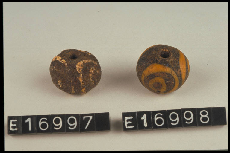 Perla di pasta vitrea nera decorata a cerchi concentrici gialli