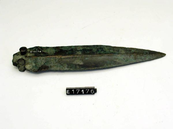Pugnale a base trapezoidale con nervatura mediana; conserva due ribattini