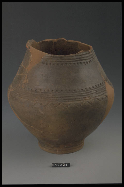 Urna biconica decorata a finta cordicella da linee e coppelle sul collo; da linee, coppelle e motivi a zig-zag lungo il diametro massimo; da linee e motivi a zig-zag sul piede