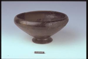 Ciotola a corpo troncoconico con orlo rientrante e basso piede obliquo; la superficie è nera e lisciata a stecco.