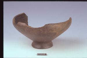 Ciotola a corpo troncoconico con orlo rientrante e basso piede obliquo.