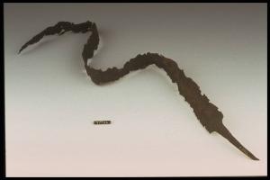 Spada con codolo a sezione rettangolare a base larga,spalla a lati concavi,lama lunga a lati paralleli e convergenti a ridosso della punta, sezione a losanga.