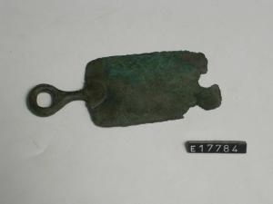 Rasoio a lama quadrangolare; manichetto in verghetta di bronzo saldato alla lama mediante due piastrine ricurve