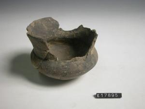 Bicchiere carenato con fondo ombelicato; sulla spalla motivo ad impressioni costrituito da tre serie di tre cuppelle ciascuna