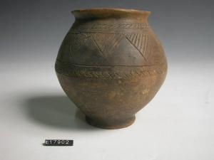 Urna biconica con motivi decorativi ad incisione: fila di denti di lupo limitata nella parte superiore da una fila di trattini obliqui e nella parte inferiore da un motivo a reticolo.