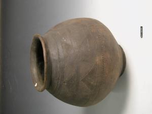 Urna biconica con decorazione ad incisione costituita da due file di denti di lupo comprese tra due file di trattini obliqui.