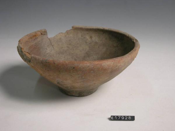 Ciotola troncoconica con labbro rientrante decorazione sovraddipinta a fasce rosse disposte a raggiera.
