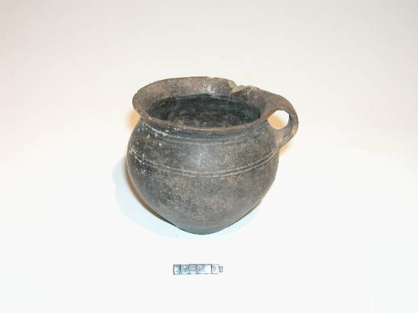 Vasetto monoansato con labbro estroflesso; sul collo e sulla spalla motivo ad incisione costituito da due linee. Il vaso contiene ossa combuste.