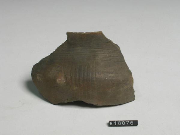 Frammento di orlo e parete pertinenti ad urna; sul collo serie di linee incise orizzontali; lungo la spalla fasci di linee con una presa a bugna.