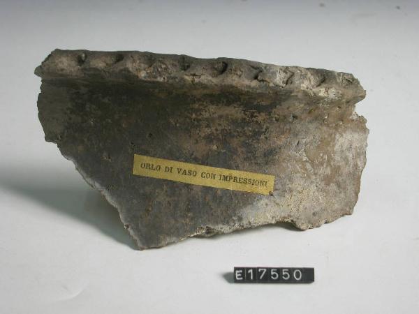 Grande recipiente con collo e parete a profilo concavo; labbro esoverso, orlo decorato a tacche impresse.