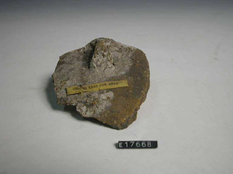 Recipiente a corpo ovoide con breve labbro svasato; ansa a nastro verticale