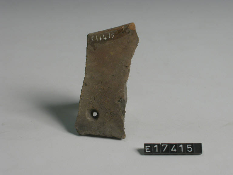Recipiente con parte superiore a profilo appena concavo, orlo assottigliato; provvisto di foro circolare.