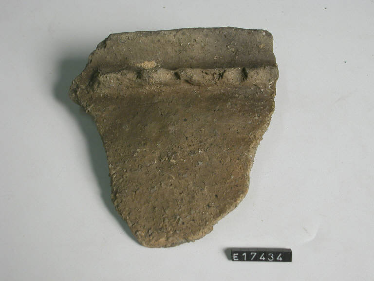 Recipiente ovoide con labbro svasato e sulla gola un cordone decorato a tacche impresse.