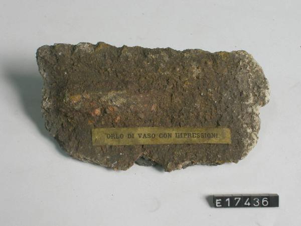 Recipiente di grandi dimensioni provvisto di segmento di cordone sulla gola, con orlo assottigliato a tacche impresse.