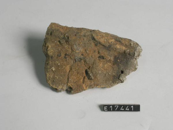 Frammento fittile a profilo convesso, con bordo piatto grossolanamente rifinito.