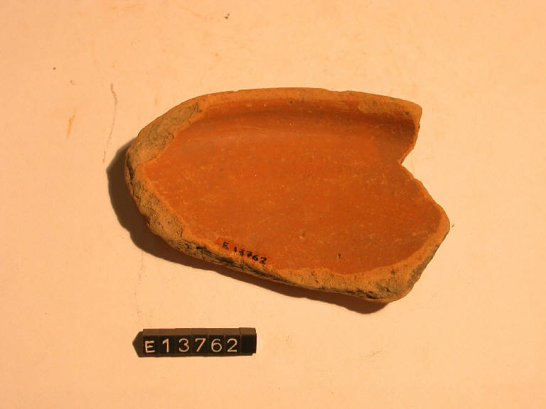 Frammento di orlo e parete di patera con labbro verticale; sono dipinte le superfici interna ed esterna.