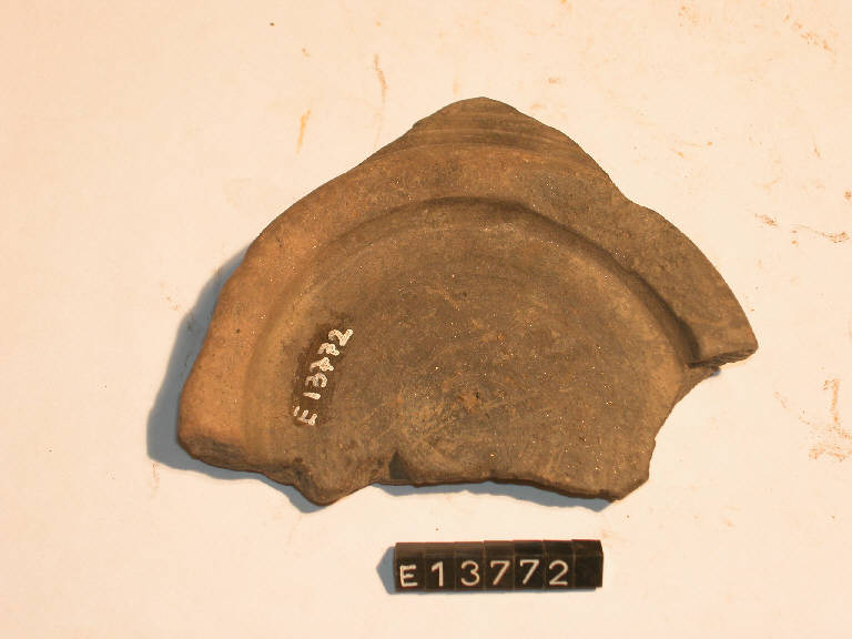 Frammento di piede ad anello; la parete esterna è decorata da costolonature concentriche, quella interna da cerchi concentrici.