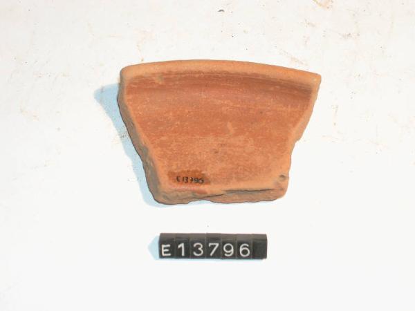 Frammento di orlo e parete di patera con labbro verticale assottigliato e tracce di dipintura sia interna che esterna.