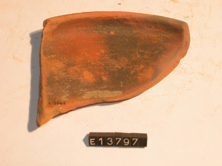 Frammento di orlo e parete di patera con labbro verticale assottigliato e tracce di dipintura sia interna che esterna.