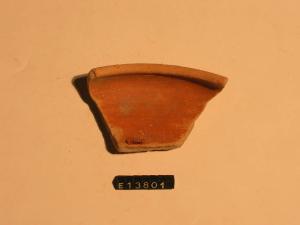 Frammento di orlo e parete di patera con labbro leggermente rientrante e tracce di dipintura sia interna che esterna.