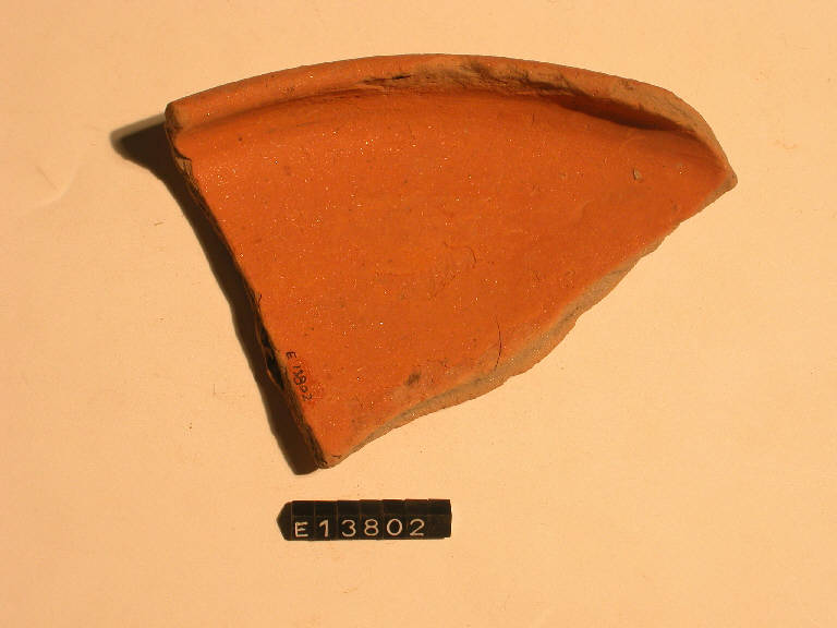 Frammento di orlo e parete di ciotola a corpo poco profondo con labbro verticale e orlo arrotondato. Tracce di dipintura sia interna che esterna.
