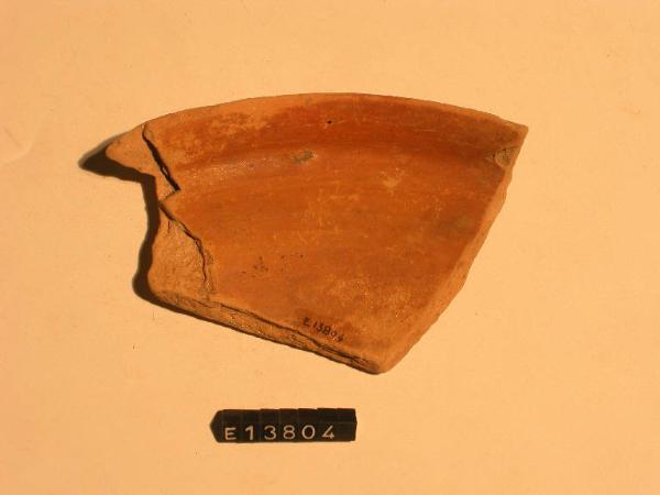 Frammento di orlo e parete di patera con labbro assottigliato verticale. Tracce di dipintura sia interna che esterna.