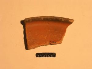 Frammento di orlo e parete di patera con labbro arrotondato verticale. Tracce di dipintura sia interna che esterna.