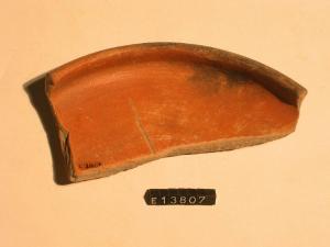 Frammento di patera con breve labbro arrotondato rientrante. Tracce di dipintura sia interna che esterna in rosso.