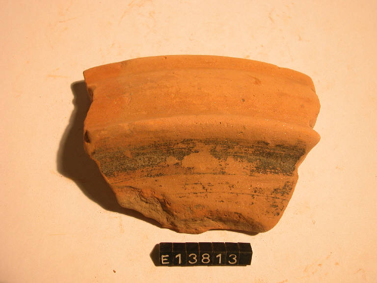 Frammento di orlo e parete di mortaio con spalla carenata, orlo arrotondato, labbro verticale con fine dipintura sotto la spalla.