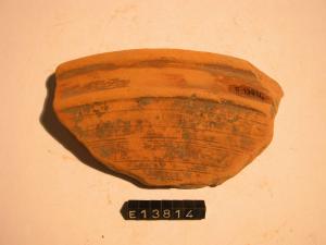 Frammento di orlo e parete di ciotola carenata a corpo troncoconico con orlo ingrossato. Tracce di dipintura sia interna che esterna.