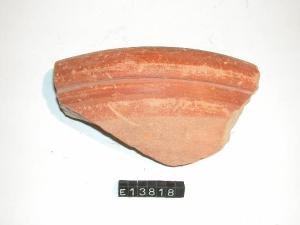 Frammento di mortaio carenato con orlo ingrossato a cordone. Tracce di dipintura interna con fasce sul labbro esterno.