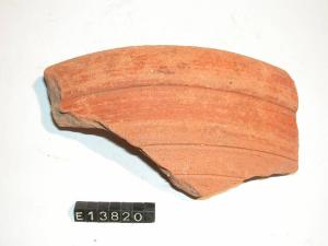 Frammento di orlo e parete di ciotola carenata con labbro verticale e orlo ingrossato. Sotto la carenatura esterna sono solcature concentriche. Tracce di dipintura sia interna che esterna.