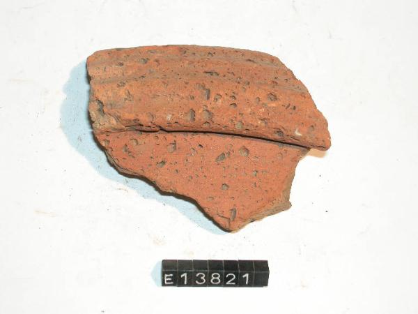 Frammento di orlo e parete di mortaio con tre costolature sul labbro a formare uno spigolo vivo con la spalla.