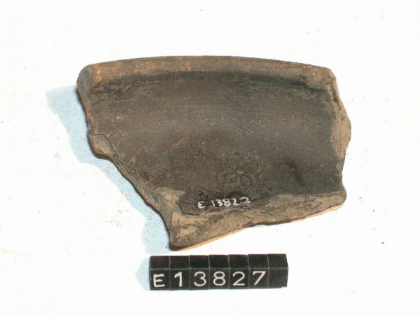 Frammento di orlo e parete di ciotola a corpo poco profondo, labbro rientrante e orlo arrotondato. Decorazione stampigliata a quadrifoglio.