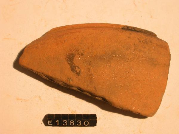 Frammento di orlo e parete di ciotola a corpo tronconico, orlo cordonato e spalla arrotondata. Dipintura sulla superficie interna e su una fascia esterna.