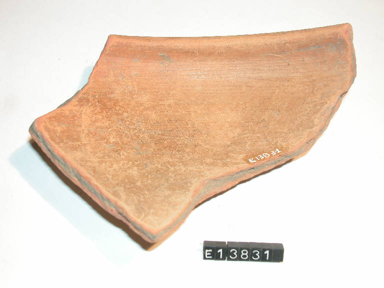 Frammento di parete di ciotola a corpo a calotta e orlo ingrossato a cordone. Dipintura sulla superficie interna e su una fascia esterna.