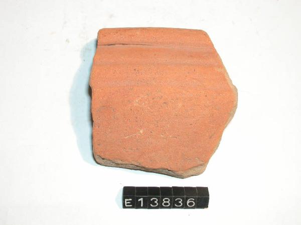 Frammento di orlo e parete di ciotola o mortaio, con corpo emisferico con due costolature sulla spalla; orlo ingrossato. Dipintura sulla superficie interna e sull'orlo.