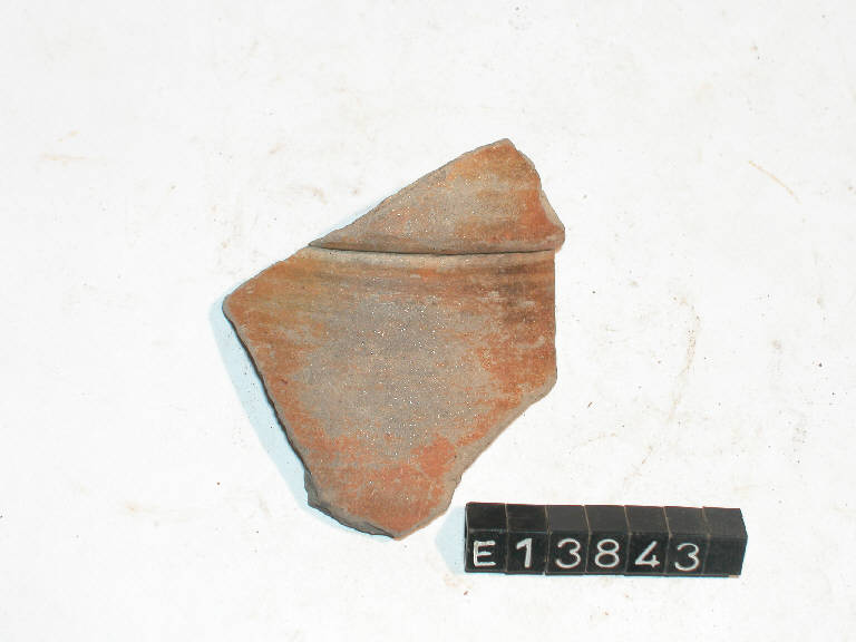 Frammento di parete di grosso bicchiere a risega mediana con dipintura sulla superficie esterna.