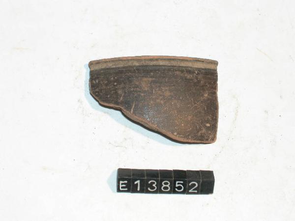Frammento di orlo e parete di bicchiere con orlo esoverso e labbro verticale. Dipintura sulla superficie esterna e per una fascia interna sovrapposta ad una riga più sottile.