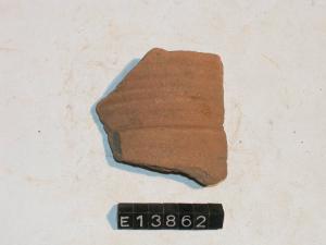 Frammento di bicchiere a risega mediana con costolature esterne e tracce di dipintura sulla superficie esterna.