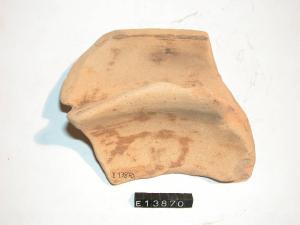 Frammento di coppa coperchio a larga tesa con labbro distinto e orlo ingrossato a cordone. Tracce di dipintura bruna.